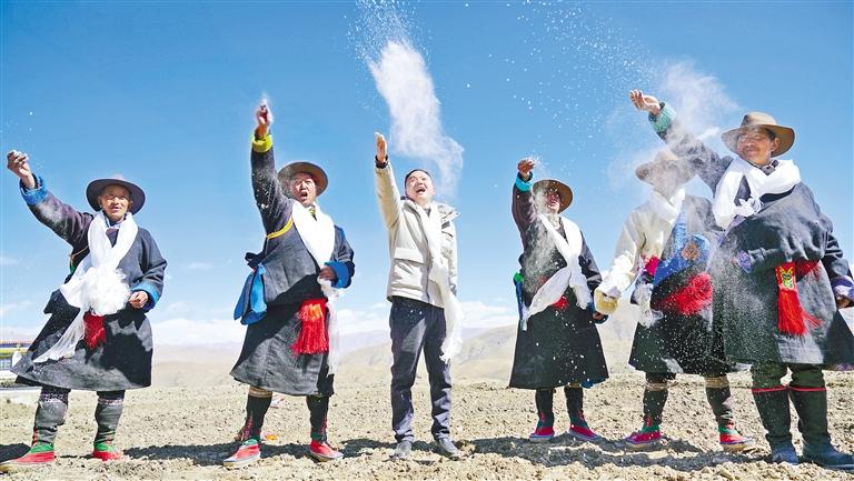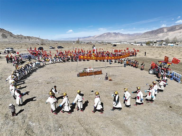 在定結(jié)縣2025年春耕開犁儀式現(xiàn)場(chǎng),身著節(jié)日盛裝的村民向參加開犁儀式的群眾獻(xiàn)上潔白的哈達(dá),舉行傳統(tǒng)的祈福儀式,吃“切瑪”、敬青稞酒、獻(xiàn)哈達(dá),每一個(gè)動(dòng)作都飽含著對(duì)土地的感恩。伴隨著拖拉機(jī)的陣陣轟鳴聲,平整的土地被犁出一道道整齊的壟溝,奏響了春耕的“交響曲”。姑娘們緊隨其后,熟練地向地里播撒青稞種子,動(dòng)作輕盈而流暢。隨后,大家一同將手中的糌粑撒向天空,共同祈愿新的一年風(fēng)調(diào)雨順、五谷豐登?,F(xiàn)場(chǎng)氣氛熱烈而莊重,每個(gè)人的臉上都洋溢著對(duì)未來美好生活的憧憬。儀式最后,大家跳起傳統(tǒng)鍋莊,歡快的舞步、悠揚(yáng)的歌聲,展現(xiàn)出對(duì)美好生活的無限向往。