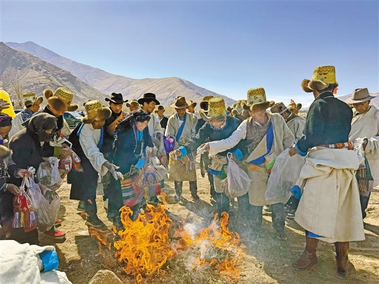 仁布縣群眾撒糌粑祈求風(fēng)調(diào)雨順?! ?/p>