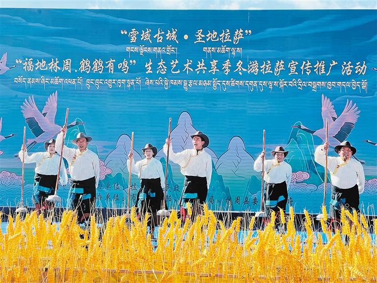 當溫暖的陽光輕柔地灑在拉薩河谷,黑頸鶴清脆的鳴叫聲喚醒了林周濕地寧靜的清晨?!案5亓种堋Q鶴有鳴”生態(tài)藝術共享季之“冬游拉薩”宣傳推廣活動,以歌舞表演、生態(tài)主旨演講、黑頸鶴攝影作品展、鶴文化專家座談等,融合了生態(tài)、藝術與文化的盛宴,讓人在雪山、湖泊與鶴影交織的詩意中,感受“冬游拉薩”的獨特魅力。