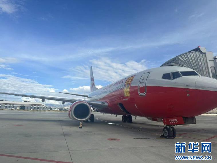 這是3月30日拍攝的停在拉薩貢嘎國(guó)際機(jī)場(chǎng)的8L9511航班。(祥鵬航空供圖)