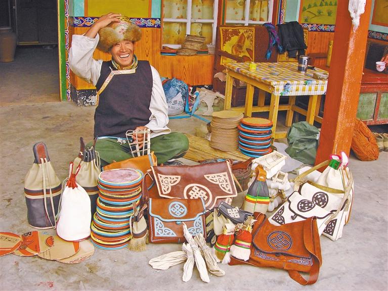手藝人展示縣級非物質文化遺產(chǎn)俊巴皮雕作品 。