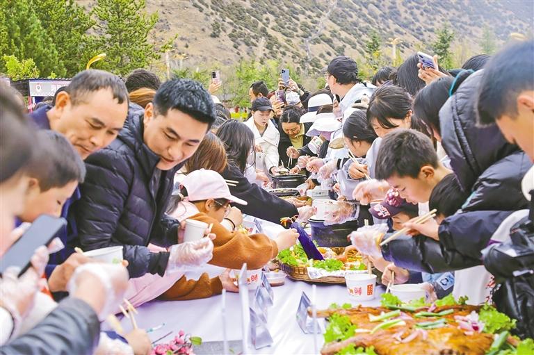 圖為在活動現(xiàn)場,市民和游客品嘗林芝特色菜。記者 劉楓 謝筱純 攝