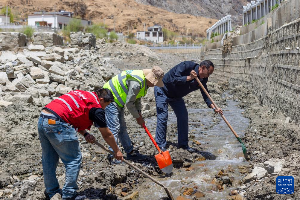尼瑪(右一)與村民一起疏通村中水道(4月24日攝)。新華社記者 姜帆 攝