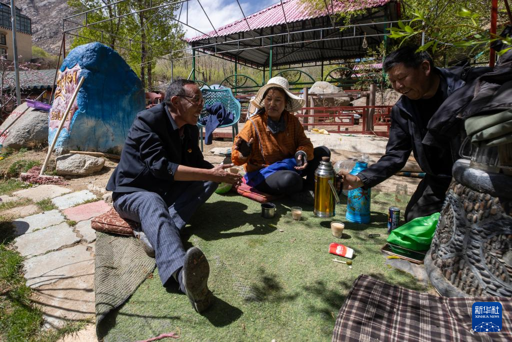 尼瑪(左一)在村里的一家農(nóng)家樂與經(jīng)營(yíng)者交談(4月24日攝)。新華社記者 姜帆 攝