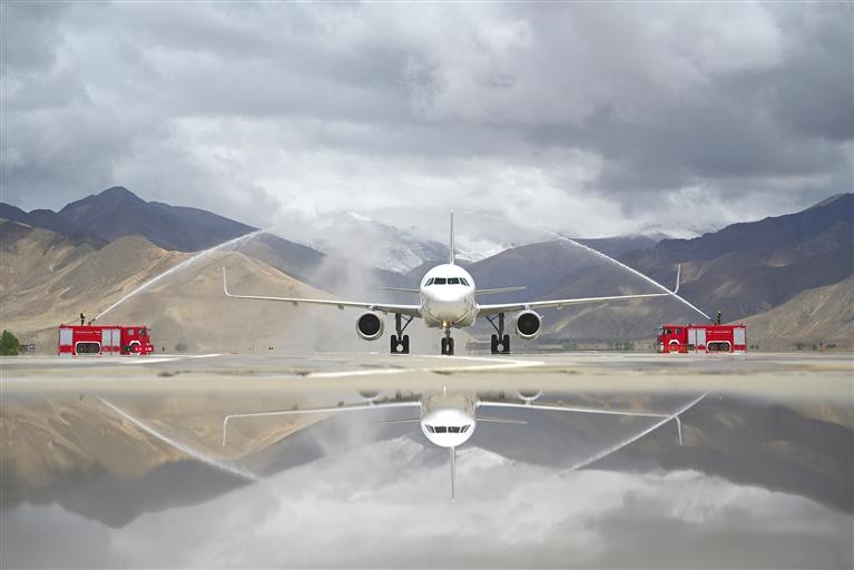 圖為5月1日,“上?!湛t”航線首航飛機(jī)在日喀則和平機(jī)場(chǎng)通過水門。記者 扎西頓珠 攝
