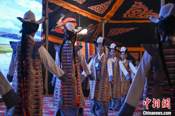 5月18日,西藏拉薩首屆“雪域古城·圣地拉薩”文化旅游節(jié)“情定當(dāng)雄”篝火鍋莊晚會(huì)在當(dāng)雄縣賽馬場(chǎng)熱鬧舉行?;顒?dòng)開場(chǎng),當(dāng)雄縣盛大的迎賓儀式,盡顯藏族人民的熱情好客。隨后,拉薩各縣區(qū)帶來極具地方特色的文藝節(jié)目,舞蹈、歌曲等表演精彩紛呈,展現(xiàn)了拉薩多元文化魅力。傍晚,游客市民在賽馬場(chǎng)黑帳篷中觀看非遺展示,深入了解藏文化精髓。夜幕降臨,眾人圍在篝火旁跳起鍋莊,歡聲笑語回蕩在高原夜空。圖為當(dāng)雄牧民手持哈達(dá)參加迎賓儀式。中新社記者 貢嘎來松 攝