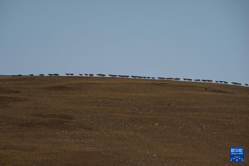 在羌塘國家級自然保護區(qū)核心區(qū)拍攝的遷徙中的雌藏羚羊群(6月9日攝)。新華社記者 旦增尼瑪曲珠 攝 ??