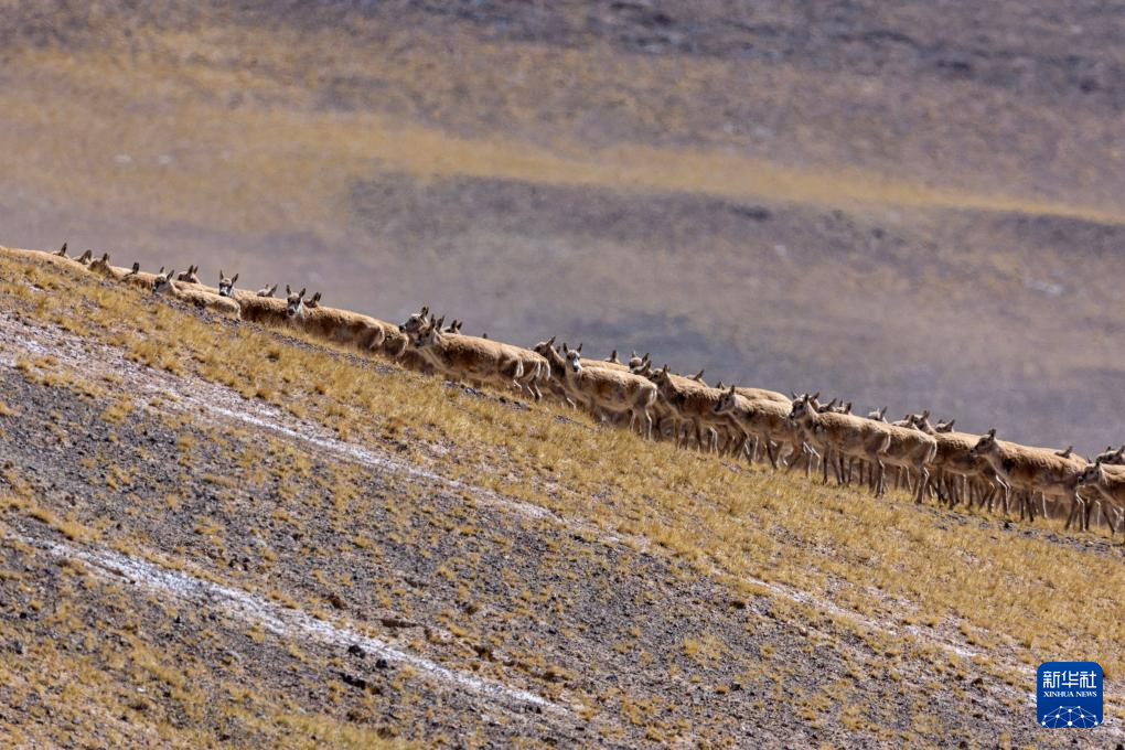 在羌塘國家級自然保護區(qū)核心區(qū)拍攝的遷徙中的雌性藏羚羊群(6月8日攝)。新華社記者 旦增尼瑪曲珠 攝 ??