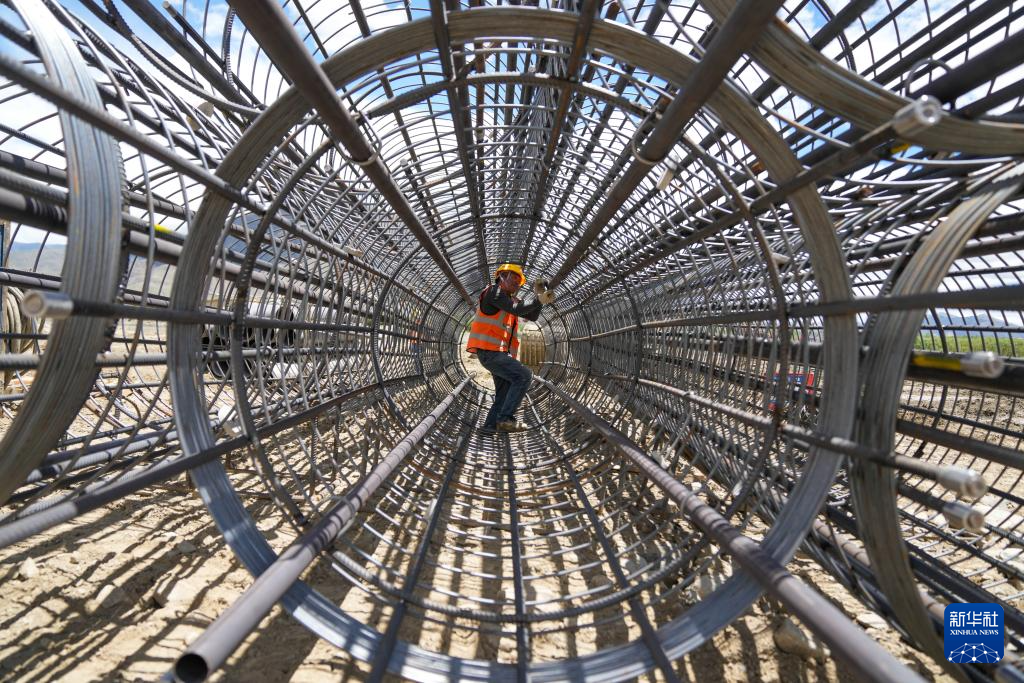 工人在薩熱路跨江大橋建設(shè)現(xiàn)場(chǎng)綁扎聲測(cè)管(6月18日攝)。新華社記者 晉美多吉 攝 ??