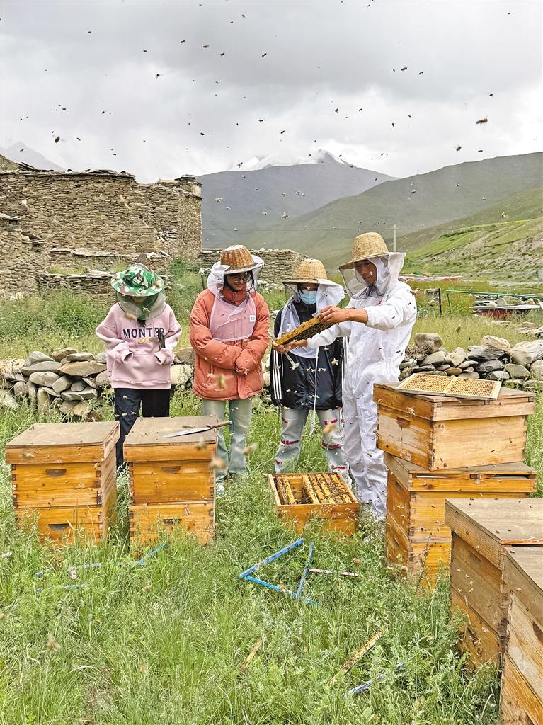 “蜂”產(chǎn)業(yè)激活鄉(xiāng)村振興“甜蜜動能”。走進卡珠村的德康瓦蜜蜂養(yǎng)殖專業(yè)合作社養(yǎng)殖基地,一排排蜂箱整齊擺放,成群的蜜蜂穿梭在花叢間,振翅的嗡嗡聲交織成一曲熱鬧的豐收曲。負責人尼瑪桑旦,一位返鄉(xiāng)創(chuàng)業(yè)的95后大學生,正帶領員工們忙碌著:“我們創(chuàng)立了‘阿媽準’藏蜜品牌,也在銷售風干牛肉、人參果、蕁麻草等特色產(chǎn)品,通過電商平臺,我們的‘哲古味’已經(jīng)賣到了全國。去年銷售額突破了115萬元,還帶動了周邊10多戶群眾增收致富。”這間小小的加工坊,正是哲古鎮(zhèn)推動傳統(tǒng)產(chǎn)業(yè)與現(xiàn)代市場接軌的生動縮影。