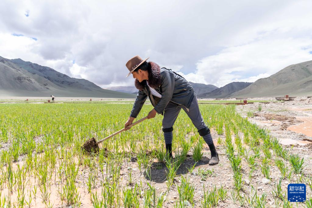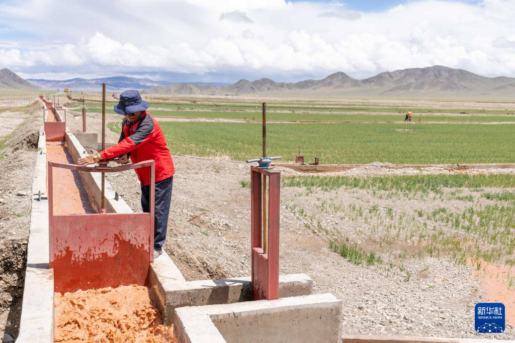 7月20日,西藏阿里地區(qū)革吉縣文布當桑鄉(xiāng)夏瑪村村民嘎瑪旺堆在人工種草基地工作。新華社記者 旦增尼瑪曲珠 攝 ??