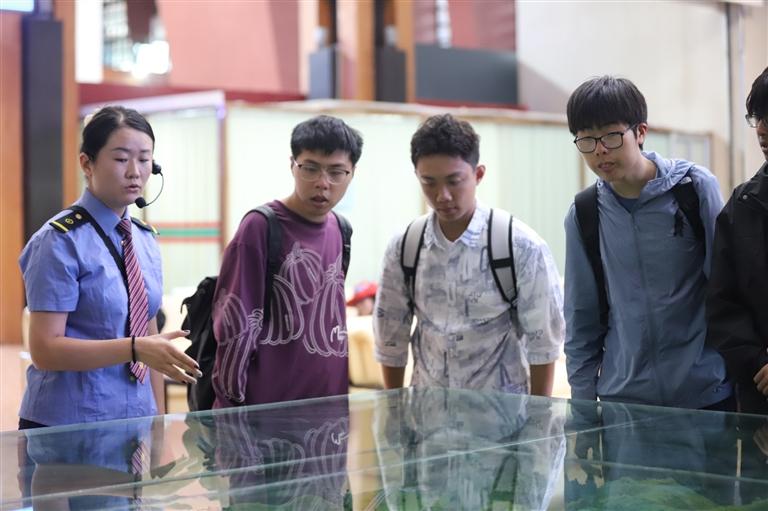 清華學(xué)子在車站教育基地文化長廊展柜旁觀看鐵路老物件。圖由 通訊員 武春燕 提供