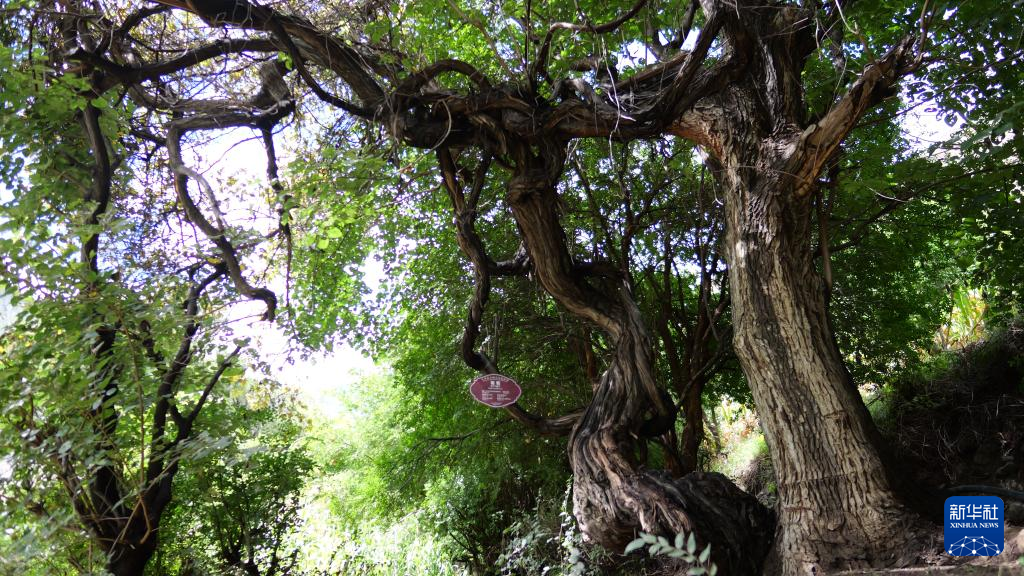 這是9月12日拍攝的左貢縣繞金鄉(xiāng)左巴村野生古葡萄樹(左),樹齡達416年。新華社記者 格桑朗杰 攝