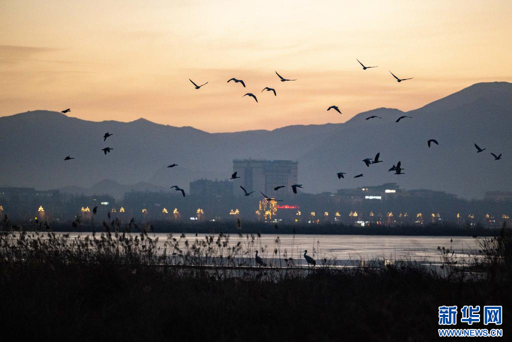 1月9日,傍晚時刻在拉薩市拉魯濕地越冬的黑頸鶴和候鳥。新華網(wǎng) 旦增努布 攝