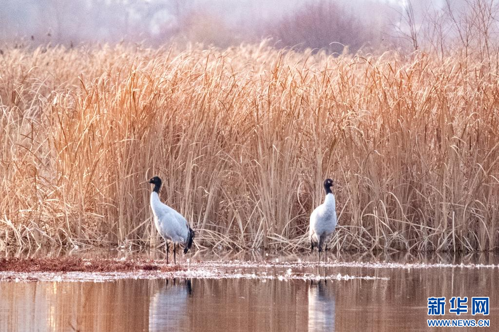 1月9日,在拉薩市拉魯濕地越冬的黑頸鶴。新華網(wǎng) 旦增努布 攝