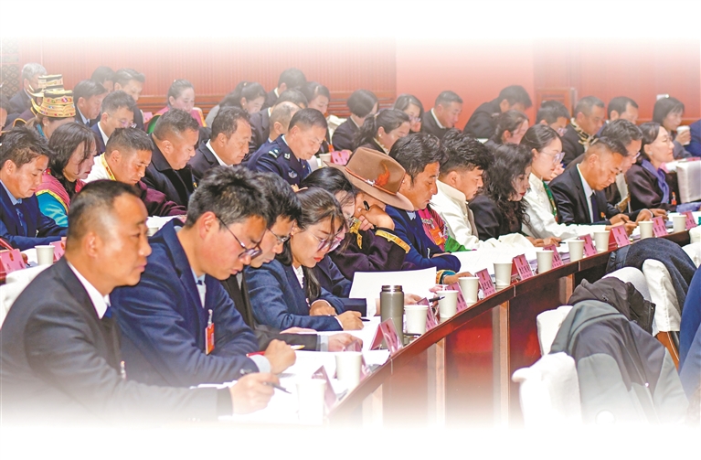 林芝市人大代表認真聆聽政府工作報告。