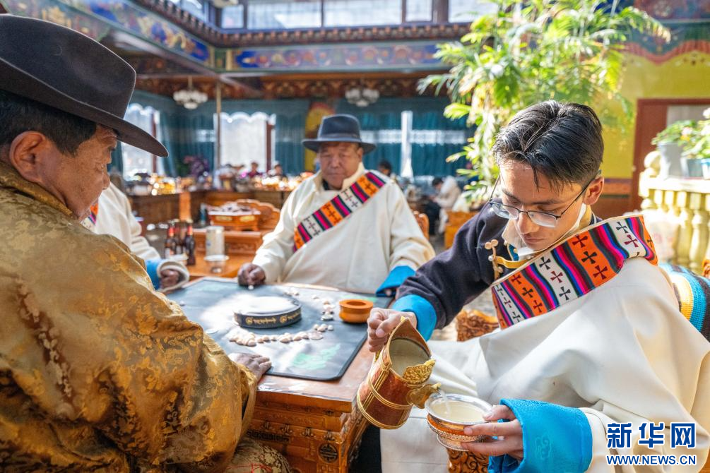 1月20日,西藏日喀則市桑珠孜區(qū)聶日雄鄉(xiāng)楚松村村民多吉旺堆家的晚輩在給長(zhǎng)輩敬青稞酒。新華網(wǎng) 旦增努布 攝
