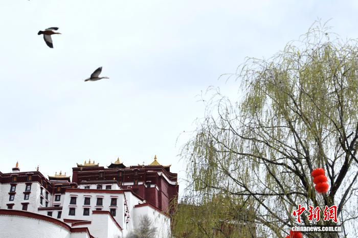 3月8日,西藏拉薩宗角祿康公園,楊柳吐綠。陽春三月,古城拉薩桃花初放、生機(jī)盎然,春意漸濃。中新社記者 貢嘎來松 攝
