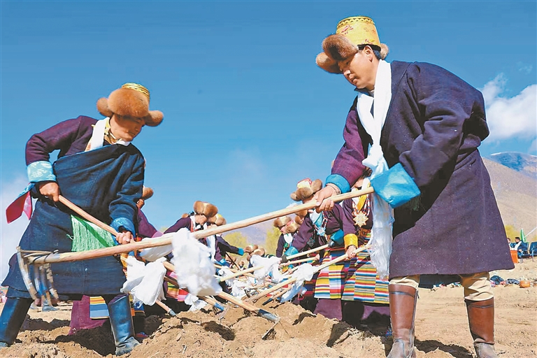 在納木那尼峰下、孔雀河畔,阿里地區(qū)普蘭縣多油村群眾身著節(jié)日盛裝舉行傳統(tǒng)春播儀式,以傳統(tǒng)民俗開啟新一年農(nóng)耕生產(chǎn)。