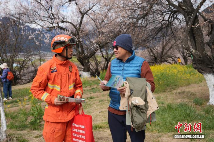 圖為指戰(zhàn)員為游客普及防火知識。 丹增平措 攝