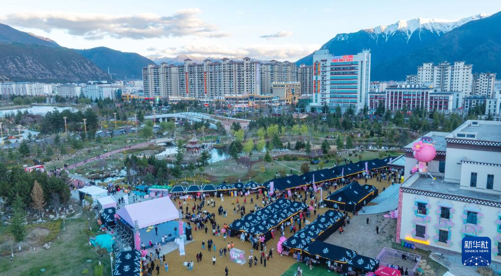 這是4月3日拍攝的林芝第二十三屆桃花旅游文化節(jié)“堆春行動”集市現(xiàn)場(無人機照片)。新華社記者 丁增尼達(dá) 攝