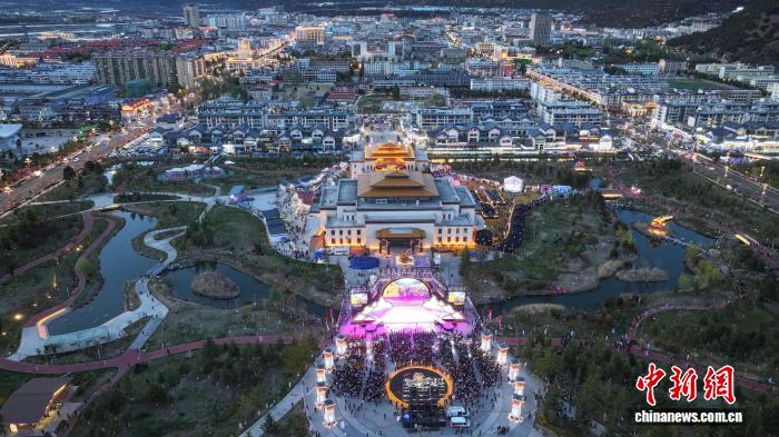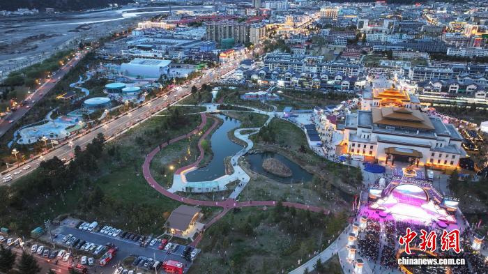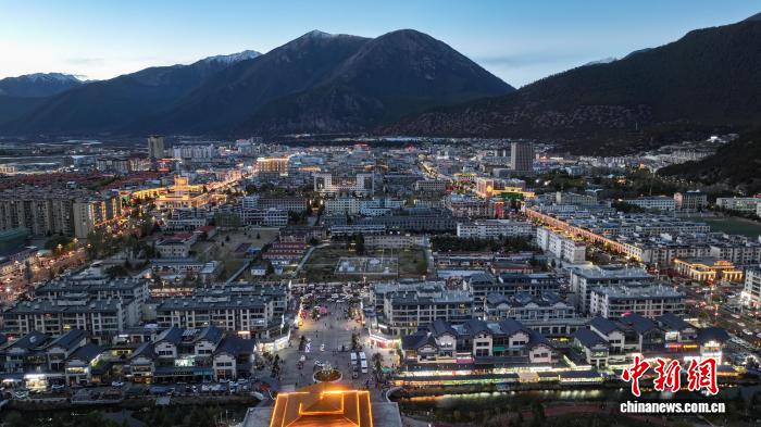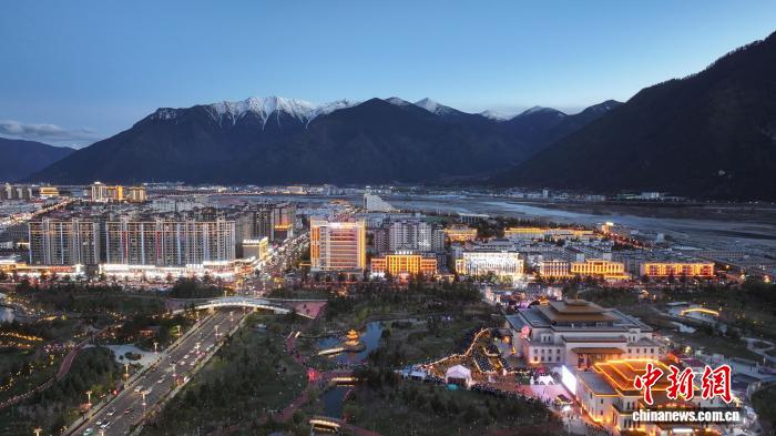 4月3日晚,西藏林芝市城市夜景美,城市建筑、街道的燈光與雪山相映成趣,景色美麗。(無(wú)人機(jī)照片)中新社記者 貢嘎來(lái)松 攝
