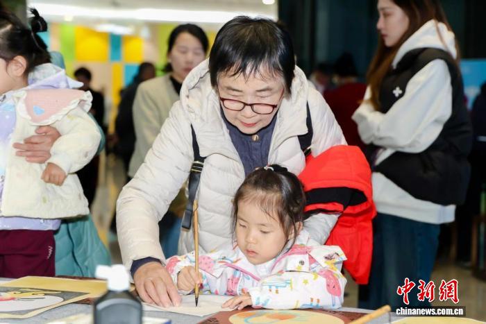 中國(guó)宋慶齡青少年科技文化交流中心(以下簡(jiǎn)稱“宋慶齡青少中心”)一層中庭,鋪著素色宣紙的長(zhǎng)桌旁,63歲的靳文虎握著孫兒靳翊言小朋友的手,共同繪制一幅秋日花卉圖,“來(lái),寶貝,感覺(jué)筆在走路?!?/p>