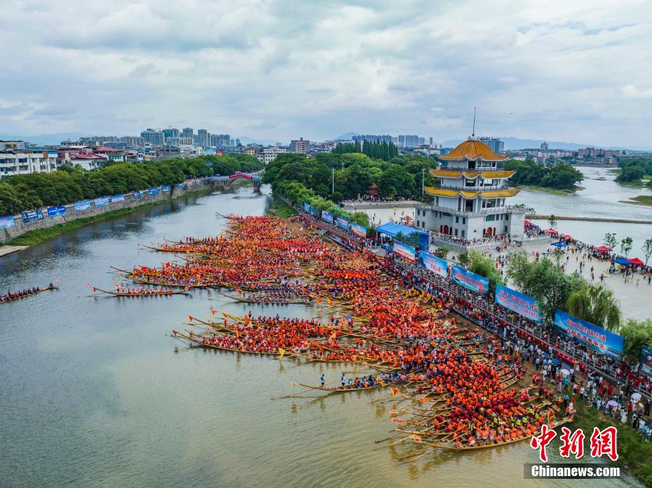 18日,“理傳千年 龍騰四?!焙嫌乐菔械揽h2023年端午節(jié)“紫金杯”國(guó)家非遺龍船賽在該縣瀟水河畔鳴鑼開賽。此次國(guó)家非遺道州龍船賽吸引該縣12個(gè)鄉(xiāng)鎮(zhèn)(街道)、73個(gè)村(社區(qū))、172艘龍船、4816名民間運(yùn)動(dòng)員參賽。圖為172艘龍船、4816名民間運(yùn)動(dòng)員參賽。
