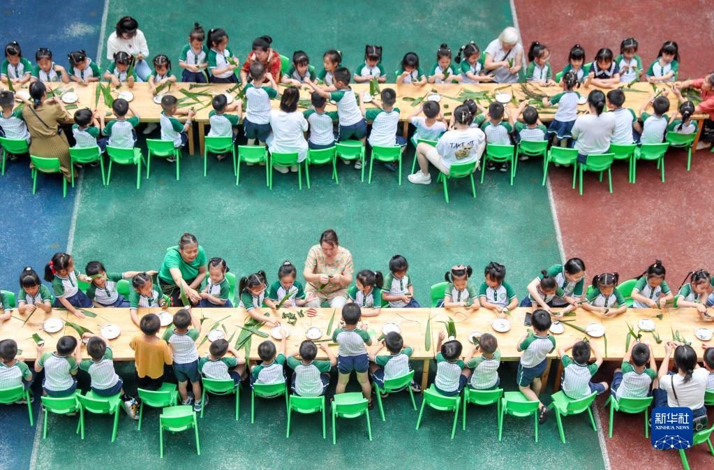 6月19日,貴州省遵義市余慶縣羽翅幼兒園的孩子們在學(xué)習(xí)包粽子。新華社發(fā)(王永娟 攝)