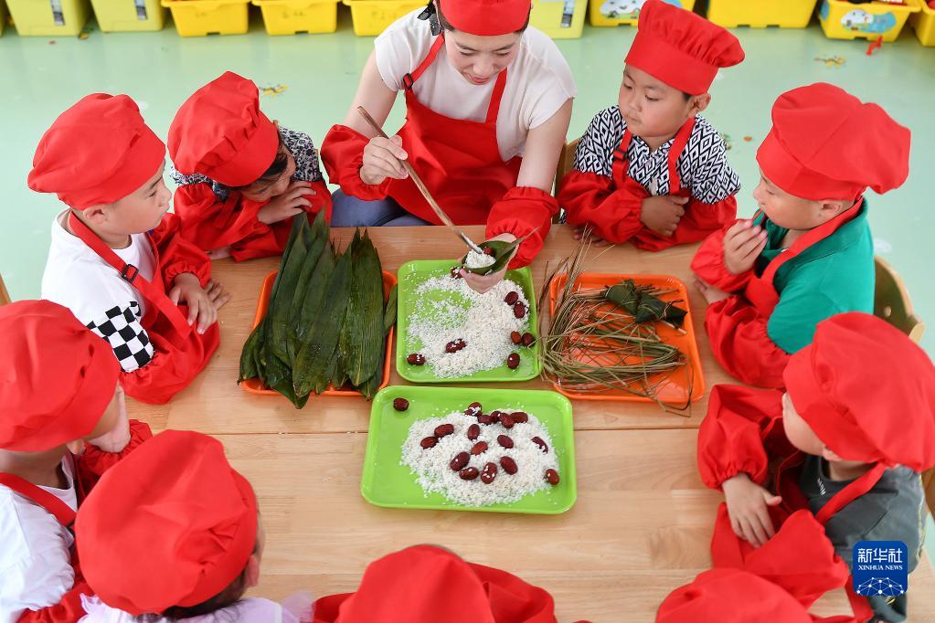 6月19日,山東省煙臺市福山區(qū)清洋街道中心幼兒園的小朋友在老師指導(dǎo)下學(xué)習(xí)包粽子。新華社發(fā)(孫文潭 攝)
