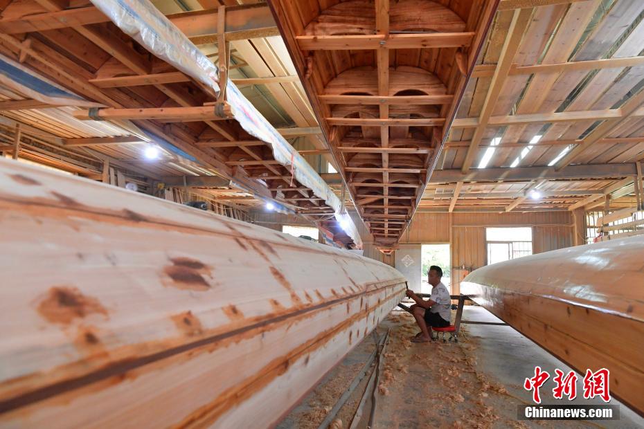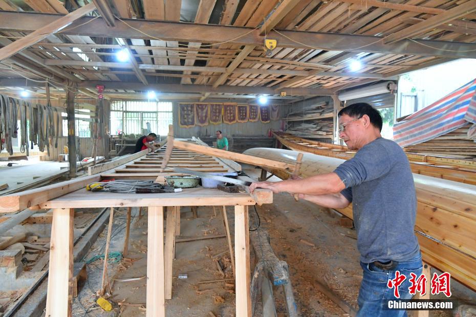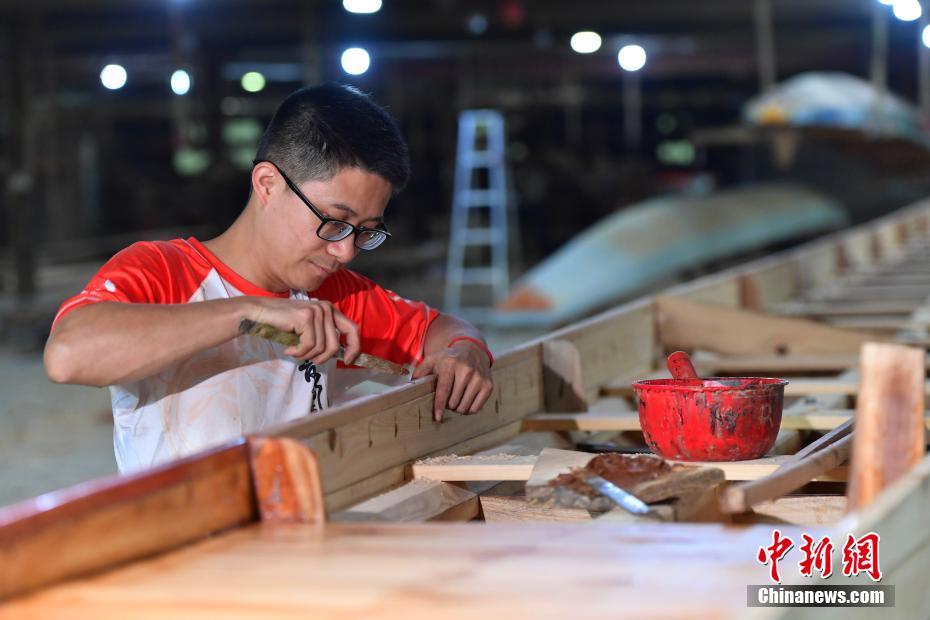 “世界龍舟看中國,中國龍舟看福州,福州龍舟看方莊?!蔽挥诟=ㄊ「V菔虚}侯縣的方莊村,是中國最大的龍舟制造村,有著七百多年制作龍舟的歷史。隨著端午節(jié)臨近,方莊村內(nèi)的龍舟制造廠里,工匠們正加班加點趕制端午節(jié)的龍舟訂單。據(jù)統(tǒng)計,目前該村每年能接到超過200艘龍舟的訂單,總產(chǎn)值約600萬元人民幣。圖為5月25日,在方莊村的“龍舟世家”方忠雄龍舟廠里,“方莊龍舟制造技藝(閩侯縣)”第四代傳承人方劍偉在趕制端午節(jié)的龍舟訂單。中新社記者 張斌 攝