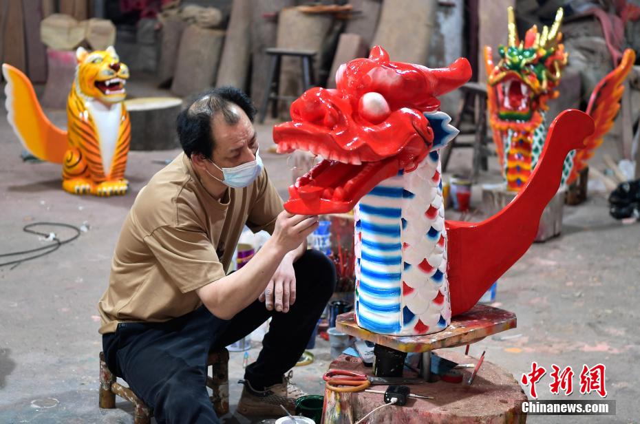 “世界龍舟看中國,中國龍舟看福州,福州龍舟看方莊。”位于福建省福州市閩侯縣的方莊村,是中國最大的龍舟制造村,有著七百多年制作龍舟的歷史。隨著端午節(jié)臨近,方莊村內(nèi)的龍舟制造廠里,工匠們正加班加點趕制端午節(jié)的龍舟訂單。據(jù)統(tǒng)計,目前該村每年能接到超過200艘龍舟的訂單,總產(chǎn)值約600萬元人民幣。圖為5月25日,在方莊村的一家龍舟龍頭制造廠里,師傅正在制作各式龍頭。中新社記者 張斌 攝