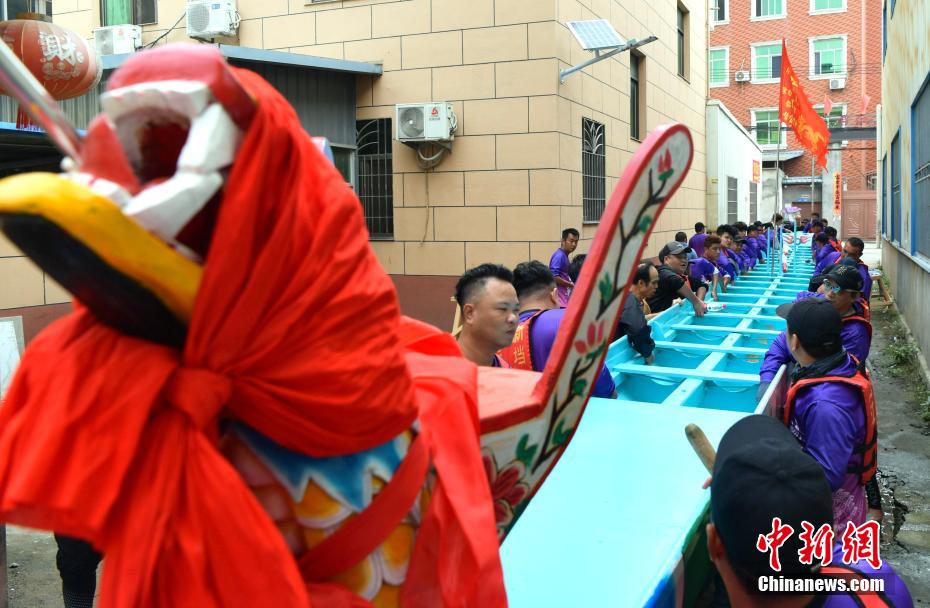 “世界龍舟看中國,中國龍舟看福州,福州龍舟看方莊?!蔽挥诟=ㄊ「V菔虚}侯縣的方莊村,是中國最大的龍舟制造村,有著七百多年制作龍舟的歷史。隨著端午節(jié)臨近,方莊村內(nèi)的龍舟制造廠里,工匠們正加班加點趕制端午節(jié)的龍舟訂單。據(jù)統(tǒng)計,目前該村每年能接到超過200艘龍舟的訂單,總產(chǎn)值約600萬元人民幣。圖為5月25日,福州倉山螺洲鎮(zhèn)的村民在方莊村迎接訂制的龍舟回村。中新社記者 張斌 攝