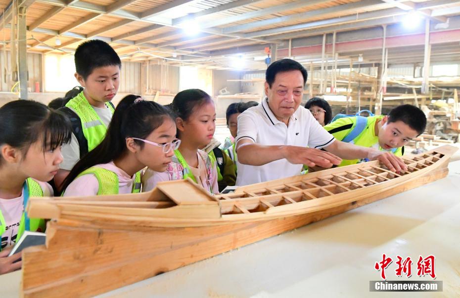 “世界龍舟看中國,中國龍舟看福州,福州龍舟看方莊。”位于福建省福州市閩侯縣的方莊村,是中國最大的龍舟制造村,有著七百多年制作龍舟的歷史。隨著端午節(jié)臨近,方莊村內(nèi)的龍舟制造廠里,工匠們正加班加點趕制端午節(jié)的龍舟訂單。據(jù)統(tǒng)計,目前該村每年能接到超過200艘龍舟的訂單,總產(chǎn)值約600萬元人民幣。圖為5月25日,在方莊村的“龍舟世家”方忠雄龍舟廠里,前來參觀的小學(xué)生在了解傳統(tǒng)龍舟的制作工藝和過程。中新社記者 張斌 攝