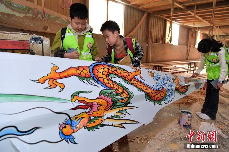 “世界龍舟看中國,中國龍舟看福州,福州龍舟看方莊?!蔽挥诟=ㄊ「V菔虚}侯縣的方莊村,是中國最大的龍舟制造村,有著七百多年制作龍舟的歷史。隨著端午節(jié)臨近,方莊村內(nèi)的龍舟制造廠,工匠們正加班加點趕制端午節(jié)的龍舟訂單。據(jù)統(tǒng)計,目前該村每年能接到超過200艘龍舟的訂單,總產(chǎn)值約600萬元人民幣。圖為5月25日,在方莊村的“龍舟世家”方忠雄龍舟廠里,前來參觀的小學(xué)生在了解傳統(tǒng)龍舟的制作工藝和過程。中新社記者 張斌 攝
