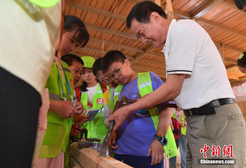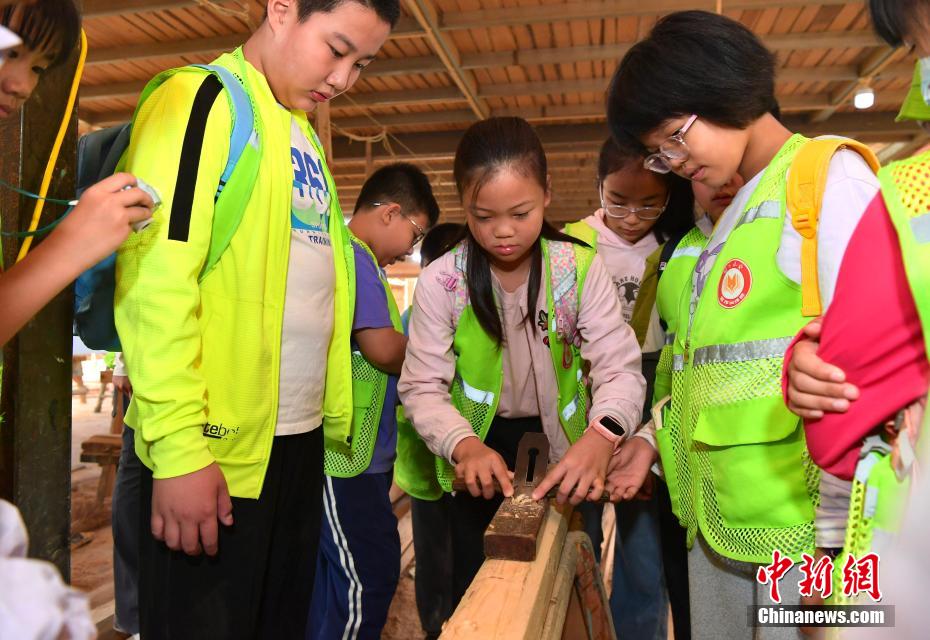 “世界龍舟看中國,中國龍舟看福州,福州龍舟看方莊?!蔽挥诟=ㄊ「V菔虚}侯縣的方莊村,是中國最大的龍舟制造村,有著七百多年制作龍舟的歷史。隨著端午節(jié)臨近,方莊村內(nèi)的龍舟制造廠里,工匠們正加班加點趕制端午節(jié)的龍舟訂單。據(jù)統(tǒng)計,目前該村每年能接到超過200艘龍舟的訂單,總產(chǎn)值約600萬元人民幣。圖為5月25日,在方莊村的“龍舟世家”方忠雄龍舟廠里,前來參觀的小學(xué)生在體驗傳統(tǒng)龍舟的制作工藝。中新社記者 張斌 攝
