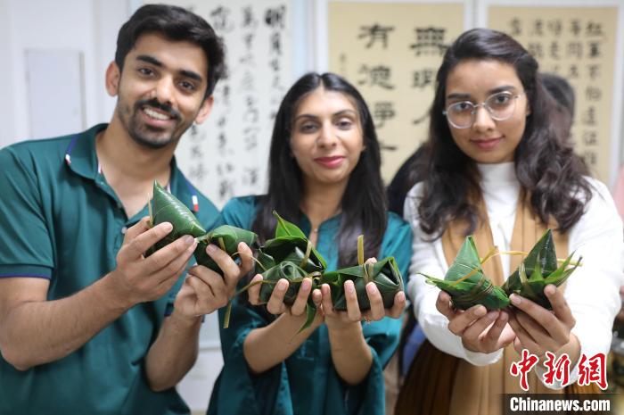 圖為外國(guó)留學(xué)生展示包好的粽子。曹建雄 攝