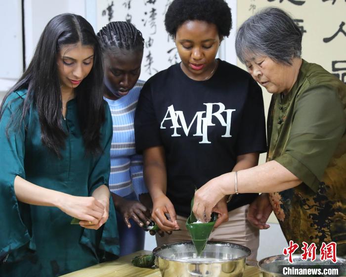 5月27日,在河北省秦皇島市海港區(qū)白塔嶺街道燕大西苑社區(qū),當(dāng)?shù)赝鈬?guó)留學(xué)生相聚一堂,通過(guò)包粽子、體驗(yàn)?zāi)景婺戤?huà)等方式,沉浸式體驗(yàn)中華文化的魅力。