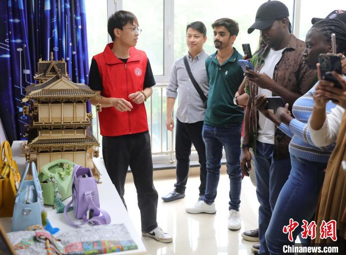 圖為志愿者帶領(lǐng)外國(guó)留學(xué)生參觀工藝品。曹建雄 攝