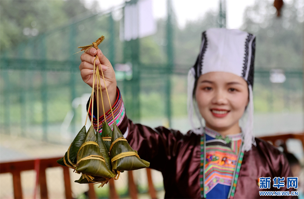 5月28日,市民在貴州省黔東南苗族侗族自治州榕江縣車民街道陽光社區(qū)展示她們包的粽子。新華網(wǎng)發(fā)(李長華 攝)