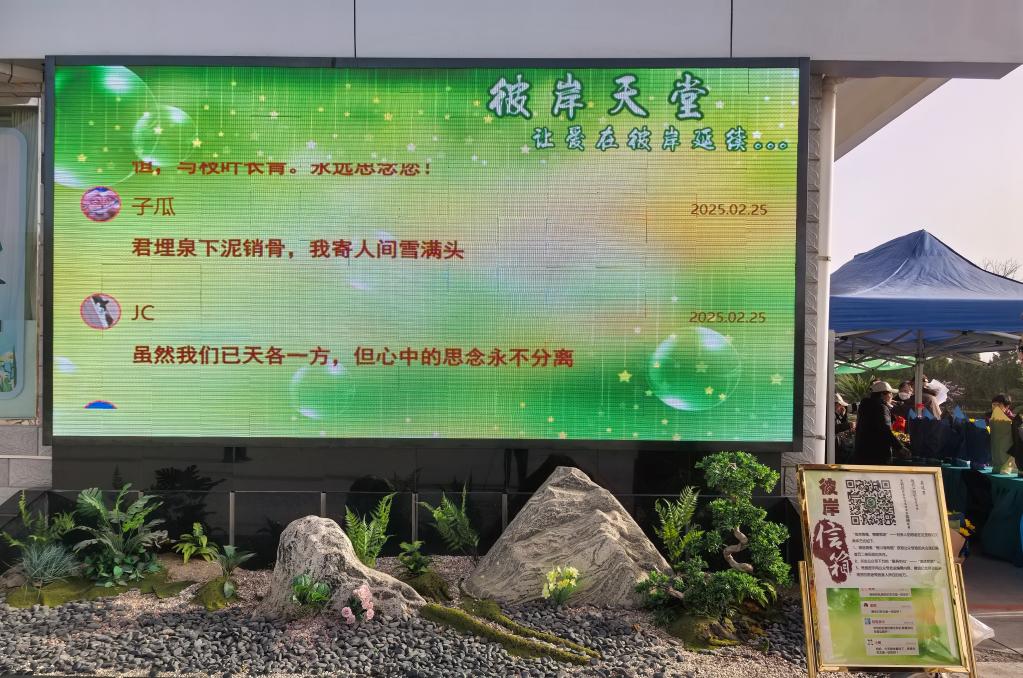 在園區(qū)入口處,一塊滿載哀思的電子屏幕引人駐足,這是網(wǎng)絡祭掃空間——“彼岸信箱”,逝者親屬只需通過微信平臺,便能將心底的牽掛發(fā)送給親人;“云祭掃”服務專區(qū)同步開設(shè),市民可通過線上平臺獻花、留言,實現(xiàn)低碳祭掃。