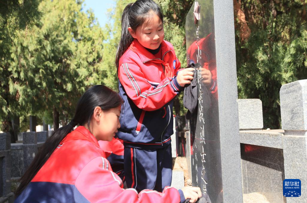 4月2日,山東省臨沂市平邑縣武臺鎮(zhèn)中心小學學生在武臺鎮(zhèn)烈士陵園擦拭烈士墓碑。