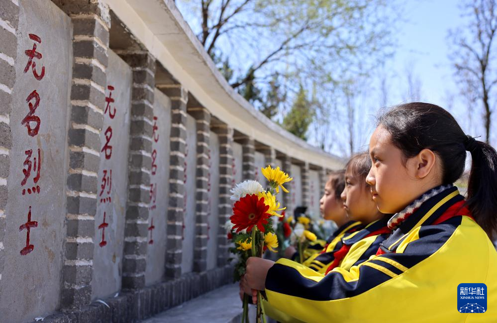 4月2日,河南省濟源市太行路學校學生在烈士陵園向革命先烈敬獻鮮花。