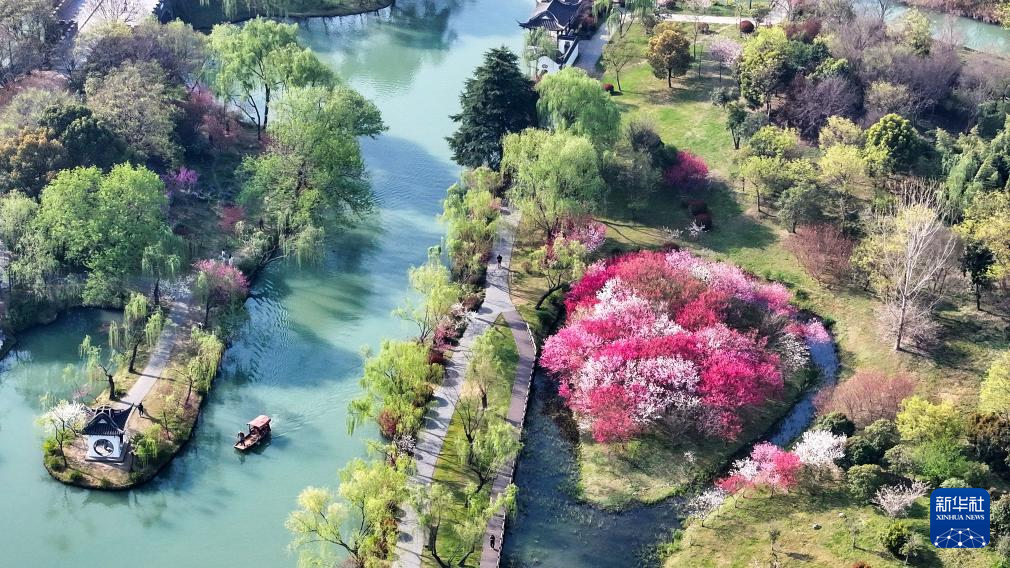 4月2日,游人在江蘇揚州瘦西湖風(fēng)景區(qū)踏春賞景(無人機照片)。