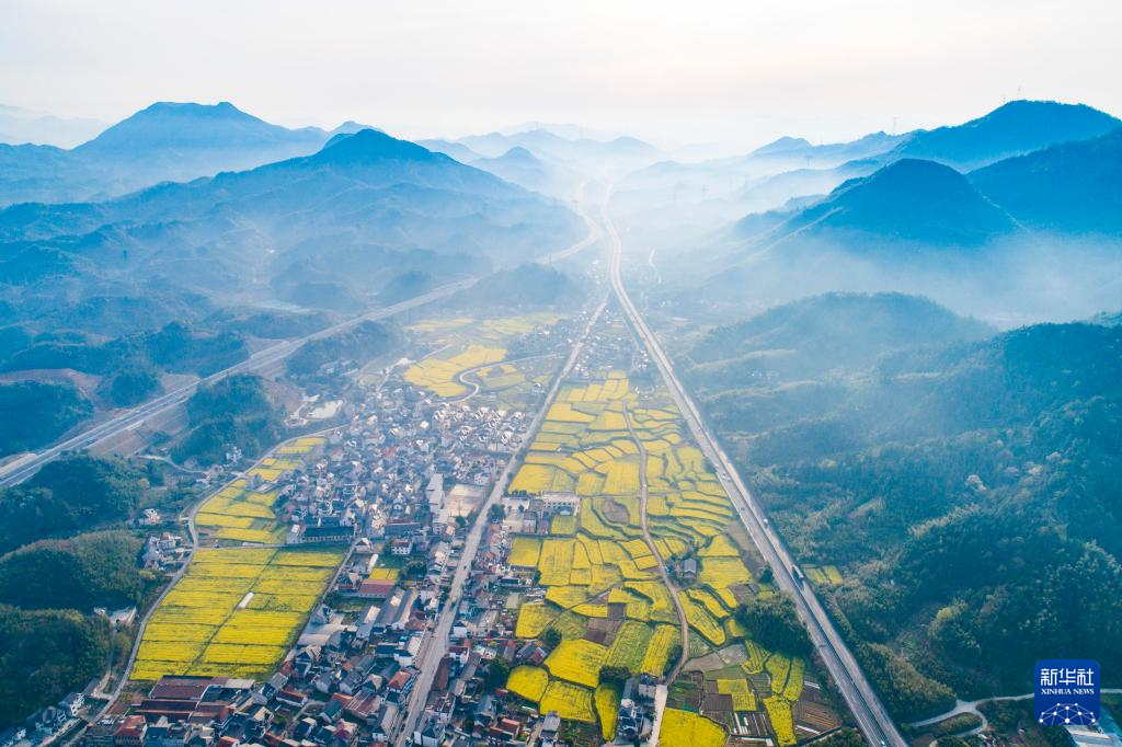 4月2日,在浙江省杭州市臨安區(qū)天目山鎮(zhèn)橫塘村,油菜花田與村莊、公路、群山構(gòu)成一幅美麗畫卷(無人機照片)。