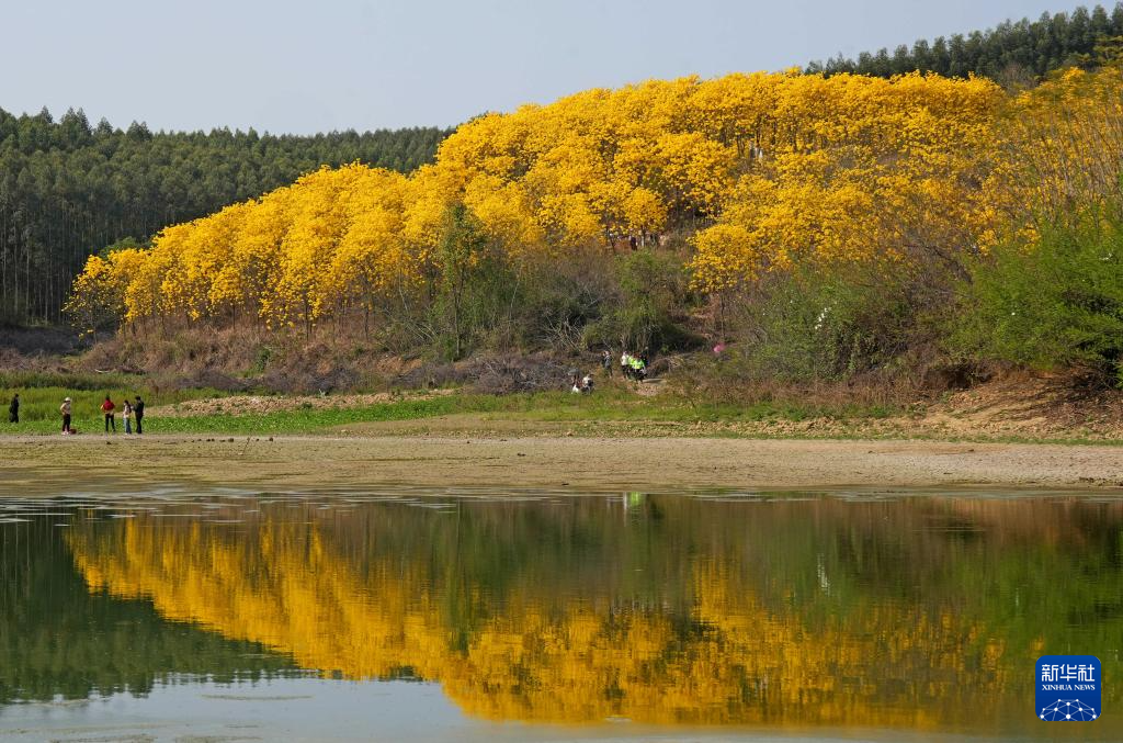 4月1日,在廣西柳州市融水苗族自治縣融水鎮(zhèn)興賢村,黃花風(fēng)鈴木黃花綻放,吸引游客前來賞花游玩。