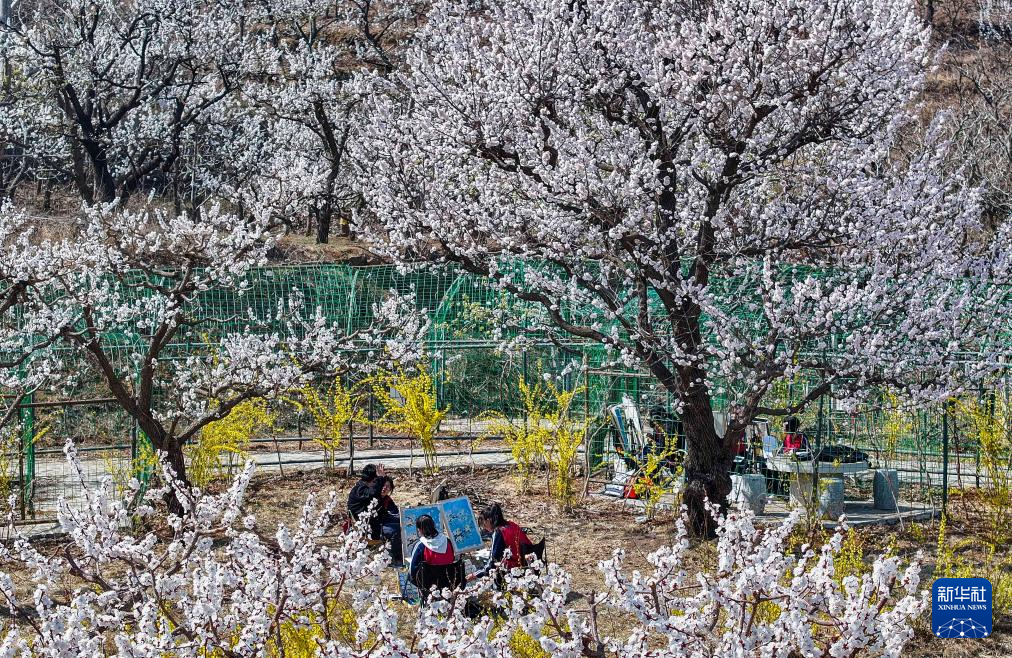 4月1日,河北省遵化市高級中學(xué)學(xué)生在遵化市南山常樂谷景區(qū)杏樹下寫生(無人機照片)。