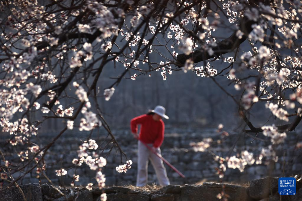 3月31日,在山東省淄博市沂源縣悅莊鎮(zhèn)前坡村,農(nóng)民在杏花盛開的田間整理土地。
