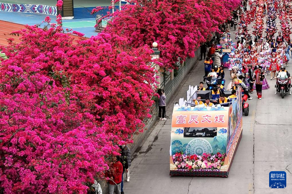 3月31日,廣西都安瑤族自治縣“三月三”慶典活動中,民俗文化巡游隊伍行走在花團錦簇的街道上。