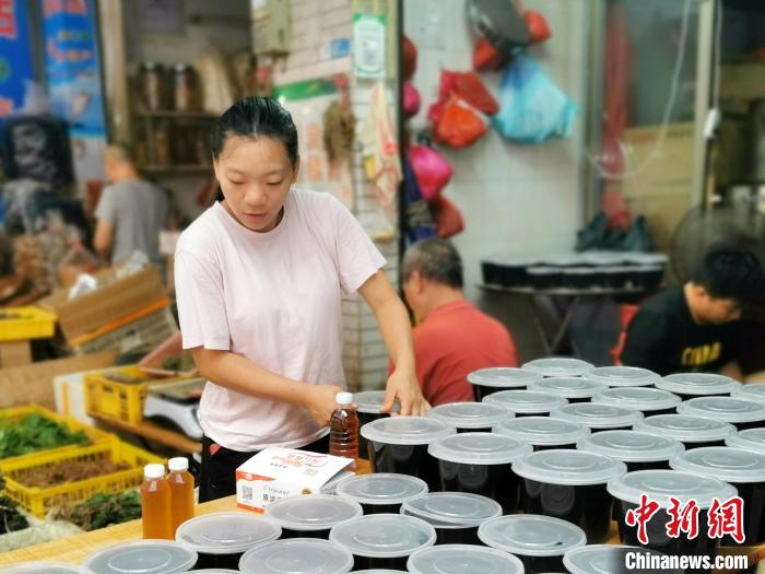 7月27日,廣東臺山市臺城富城市場,一攤主為客人打包小桶裝茯苓膏。李曉春 攝